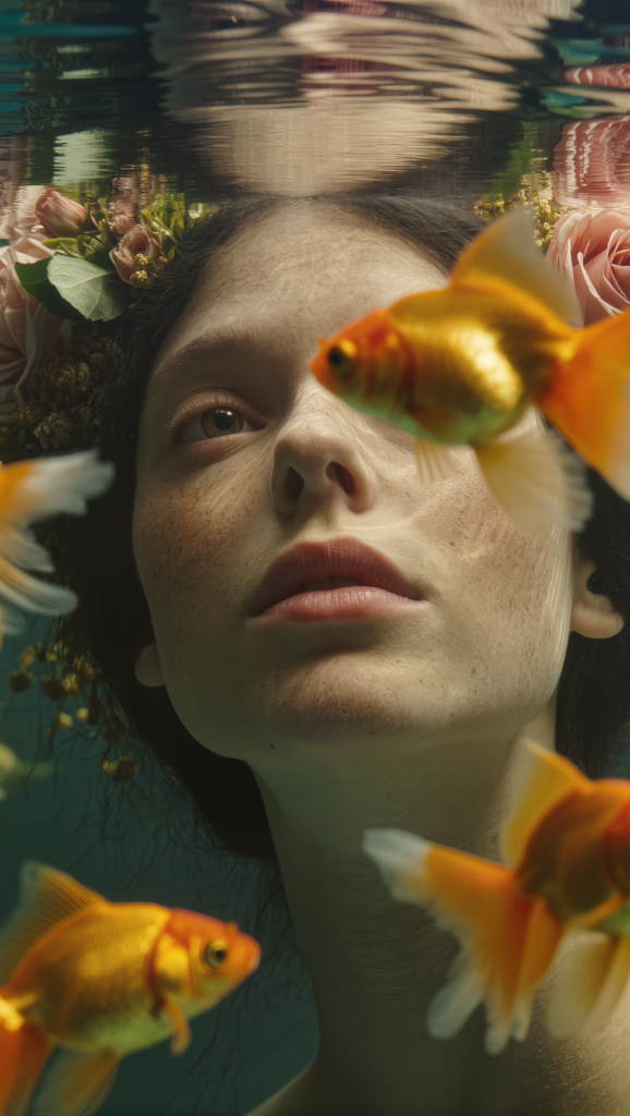 Prompt: Ultra-detailed underwater portrait of a young woman submerged just below the water surface. Her face is centered and softly lit with warm, golden light filtering through rippling water above. She has pale skin with visible freckles, natural red lips, and a calm, distant expression, eyes gazing slightly off-camera. Her dark hair floats gently, adorned with an elaborate floral headpiece made of pink roses, green leaves, and organic foliage intertwined into the hair. Multiple goldfish swim freely around her face and head, some passing close to the lens, partially obscuring the frame with soft motion blur. The water surface creates shimmering distortions and reflections above her head. Color palette is warm gold, teal blue, soft greens, and muted pinks. Shallow depth of field with foreground fish blurred and the subject’s face in sharp focus. Dreamlike, painterly realism with photographic detail. Soft natural light, underwater refraction, cinematic surreal mood, fine skin texture, realistic water particles, organic motion.